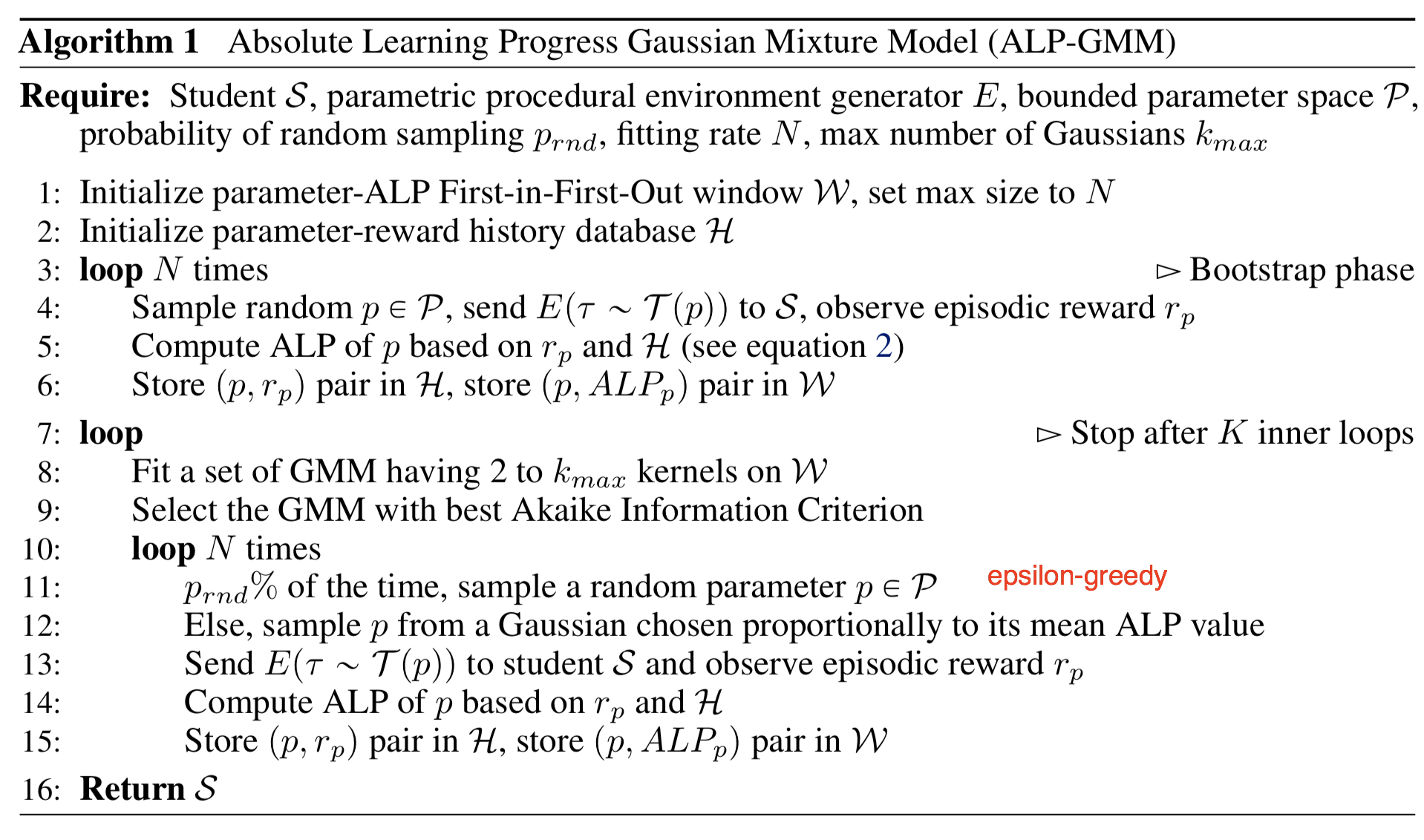 On top of the task parameter space, a Gaussian mixture model (GMM) is trained to fit the distribution of $ALP_p$ over $p$. $\epsilon$-greedy algorithm is used when sampling the tasks; with some probability sampling at random, otherwise sampling proportionally to ALP score from the GMM model.