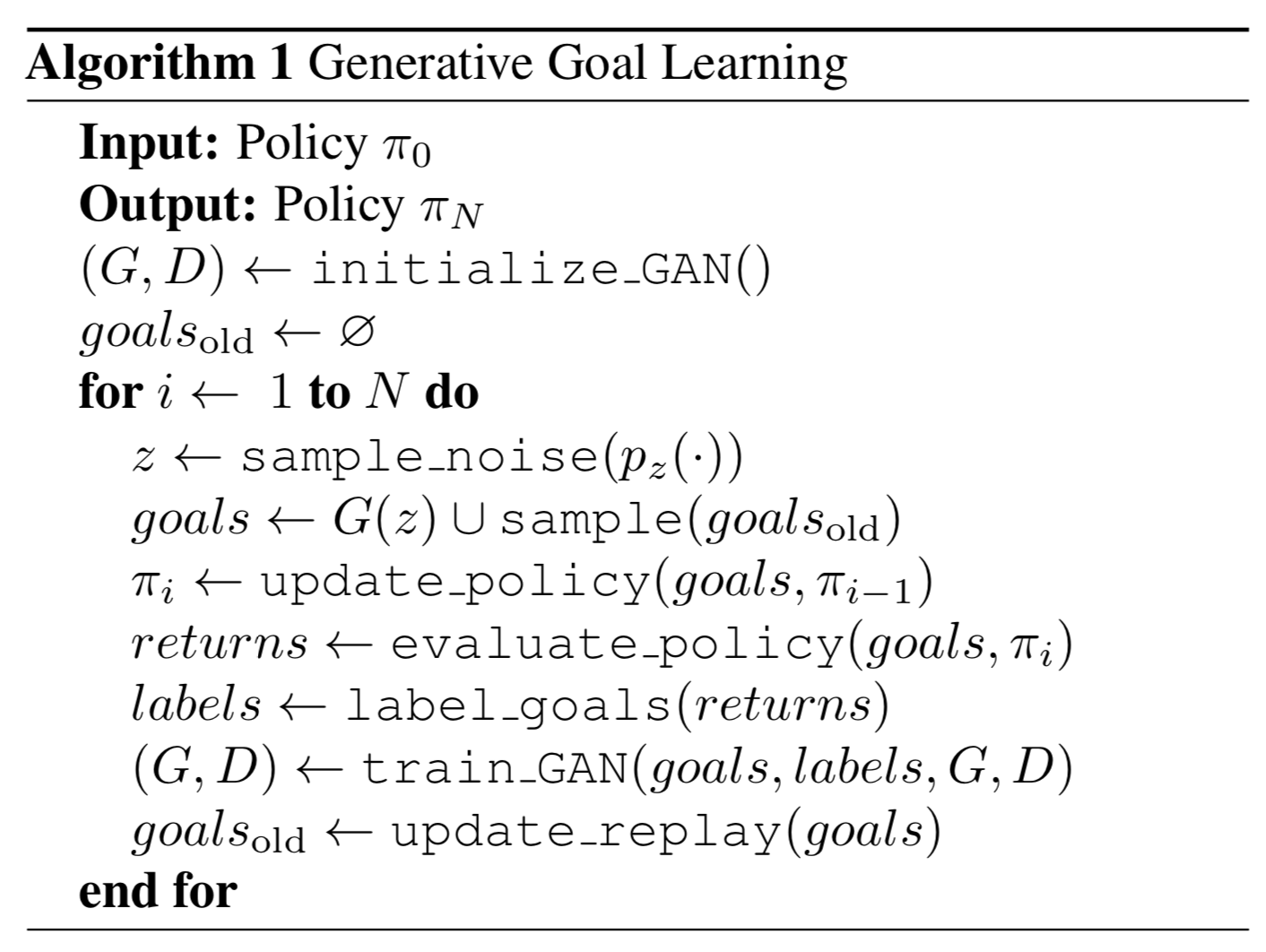 One approach for Automatic Goal Generation is to rely on Goal Generative Adversarial Networks (GAN) to generate desired goals automatically, proposed by Florensa et al., 2018. A goal $g \in \mathcal{G}$ can be defined as a set of states $S^g$ and a goal is considered achieved whenever an agent arrives at any of those states. In the original experiment the reward is a binary flag for whether the goal is achieved or not, and the policy $\pi$ is conditioned on the goal (and $R^g(\pi)$ is the expected return).