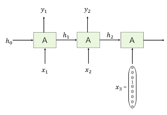 It is important to note that inputs $x_i \in X$ and outputs $h_i \in H$ in all steps are different to each other, while the RNN itself $A$ remains unchanged. That is, the same set of weights and activations are used to process each element of the sequence. The weights matrices $W_{xh}$ (weights from input), $W_{hh}$ (recurent weights), and $W_{hy}$ (weights from $hidden \rightarrow output$) are identical at every time step, what changes at each step is the input $x_t$ and the hidden state $h_t$. This drastically reduces the number of parameters used. We can define the architecture of RNN, and the processing of first element in the sequence as: