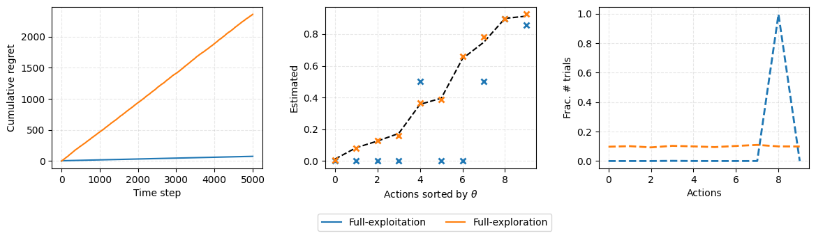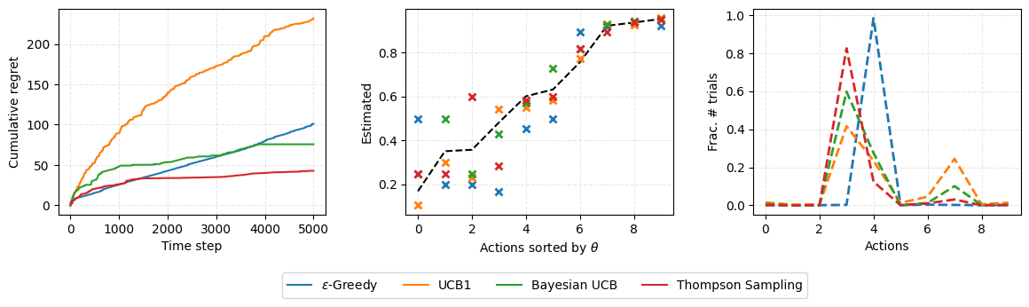 \[\mathcal{L}_T = \mathbb{E} \bigg[\sum^T_{t=1} (\theta^* - Q(a_t)) \bigg]\]Bandit Strategies