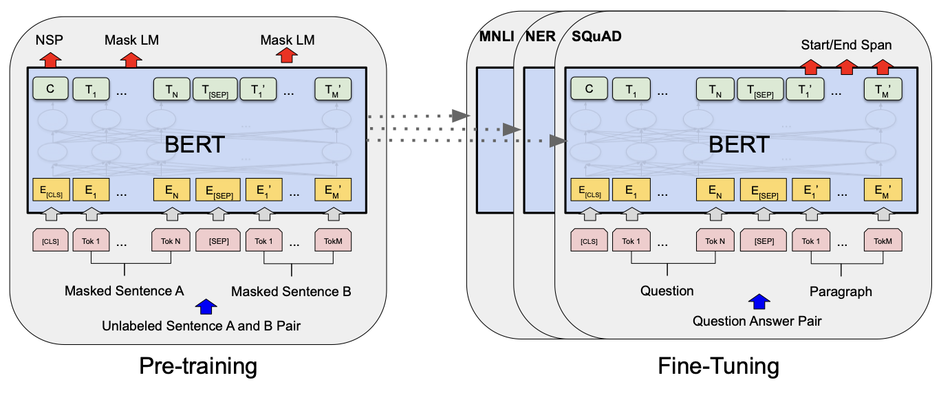 BERT is pre-trained using two unsupervised tasks. First, Masked LM (MLM) is used to mask some percentage of input tokens at random, and subsequently predict those masked tokens. The final hidden vectors corresponding to the mask tokens, are fed into an output softmax over the vocabulary (same as in a standard LM). BERT mask $15%$ of all tokens in each sequence. It only predicts masked words rather than reconstructing the entire input. Similarly, BERT also incorporates the Next Sentence Prediction (NSP) technique to understand the relationship between two sentences. NSP is a binarised task that can be trivially generated from any monolingual corpus (e.g., choose sentences $A, B$, that at random either actually follow each other $IsNext$ or don’t $NotNext$). Pre-training towards this task is very beneficial to both QA and NLI. BERT uses BookCorpus (800M words) and English Wikipedia (2500M words) as its pre-training corpus. Subsequently fine-tuning is straightforward as self-attention mechanism allows BERT to model many downstream tasks by swapping out the appropriate inputs and outputs. Compared to pre-training this step is also relatively inexpensive.