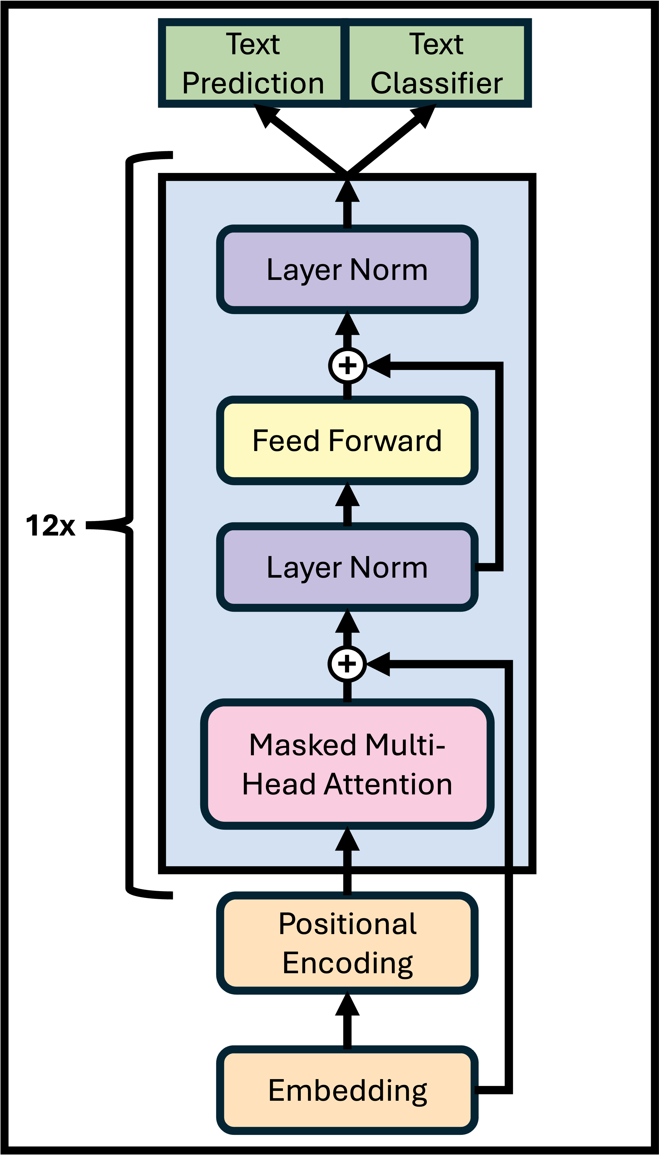 \[L_1(\mathcal{U}) = \sum_i log P(u_i \mid u_{i-k}, \dots, u_{i-1}; \Theta)\]They use a multi-layer Transformer decoder for the language model, a variant of the original Transformer architecture. We prepare the input token sequence $\mathcal{U}$ through embedding $W_e$ and positional encoding $W_p$. This is followed by a decoder layer that consists of a masked multi-headed self-attention and FFN sublayers to produce output distribution over target tokens ($n$ is the number of layers).