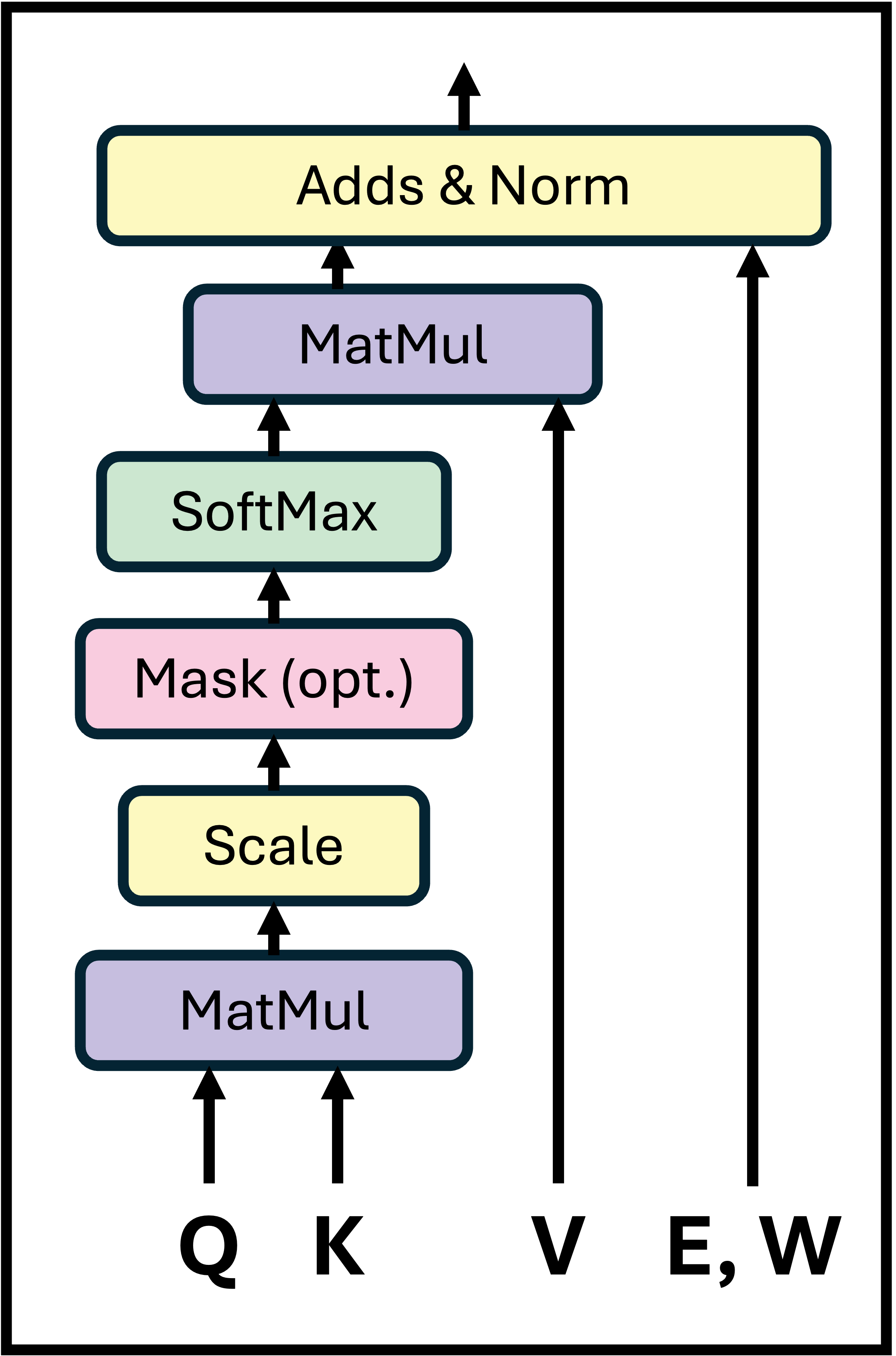 \[Attention(Q, K, V) = Z = softmax \bigg(\frac{Q K^T}{\sqrt{d_k}} \bigg) V\] \[E' = E + Z W^O\]