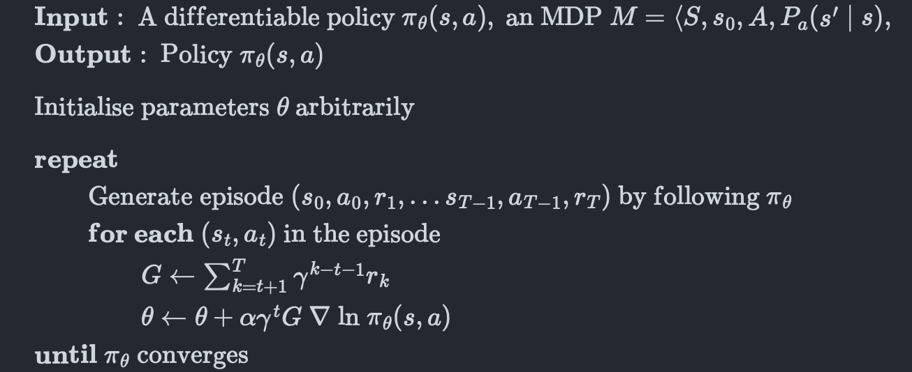 The algorithm iteratively generates and executes new actions $a$, by sampling from its policy. Once an episode terminates, a list of the obtained rewards and visited states is used to update the policy. Hence, the policy is only updated at the end of each episode. REINFORCE is an on-policy learning approach (sample trajectories directly from $\pi_{\theta}$).