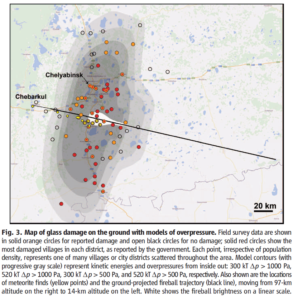 Asteroids 10-100 m in diameter can penetrate deep into Earth’s atmosphere and disrupt catastrophically, generating an atmospheric disturbance. Such an event occurred over the city of Chelyabinsk in Russia, in 2013, releasing energy equivalent to about 520 kilotons of TNT (1 kt TNT is equivalent to $4.184 \times 10^{12}$ J), and injuring thousands of people (Popova et al., 2013; Brown et al., 2013).