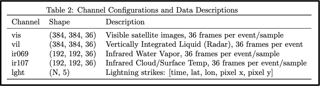 - “vil” - 384x384 image with 36 frames per event/sample (36, 384, 384)