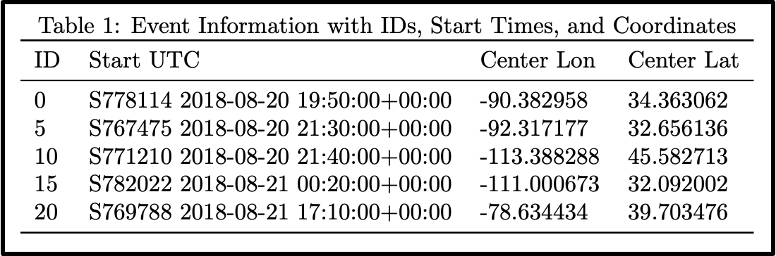 The train.h5 dataset however; contains important information about each event, to later feed into our models. Each event can be identified through its id loaded from events.csv. As discussed, for each such event there are 4 image channels, and a lightning time series of the following shape: