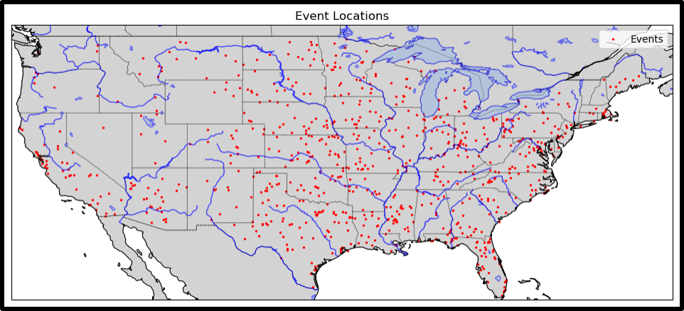 We can also consider the spatial imbalance. Given that the data was recorded in within the borders of the United States (USA), and that we have access to latitude and longitude of our events. We can plot the locations of each recorded event over the map to visualise the spatial distribution: