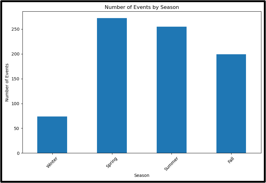 The histogram shows that most of the events were recorded in the evening/night hours (18:00 to 24:00). While there is not a big imbalance, this is still something to take into account when designing our prediction models. Similarly, in seems that most events were recorded in summer and spring seasons. Again, the imbalance is not too big.
