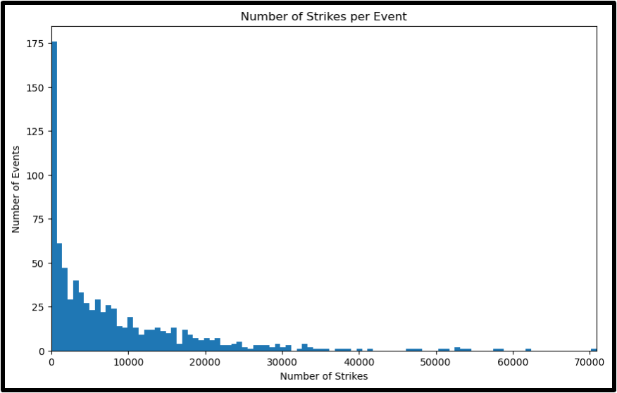 When it comes to data imbalance, we can plot the total number of strikes across all events to visualise the distribution.